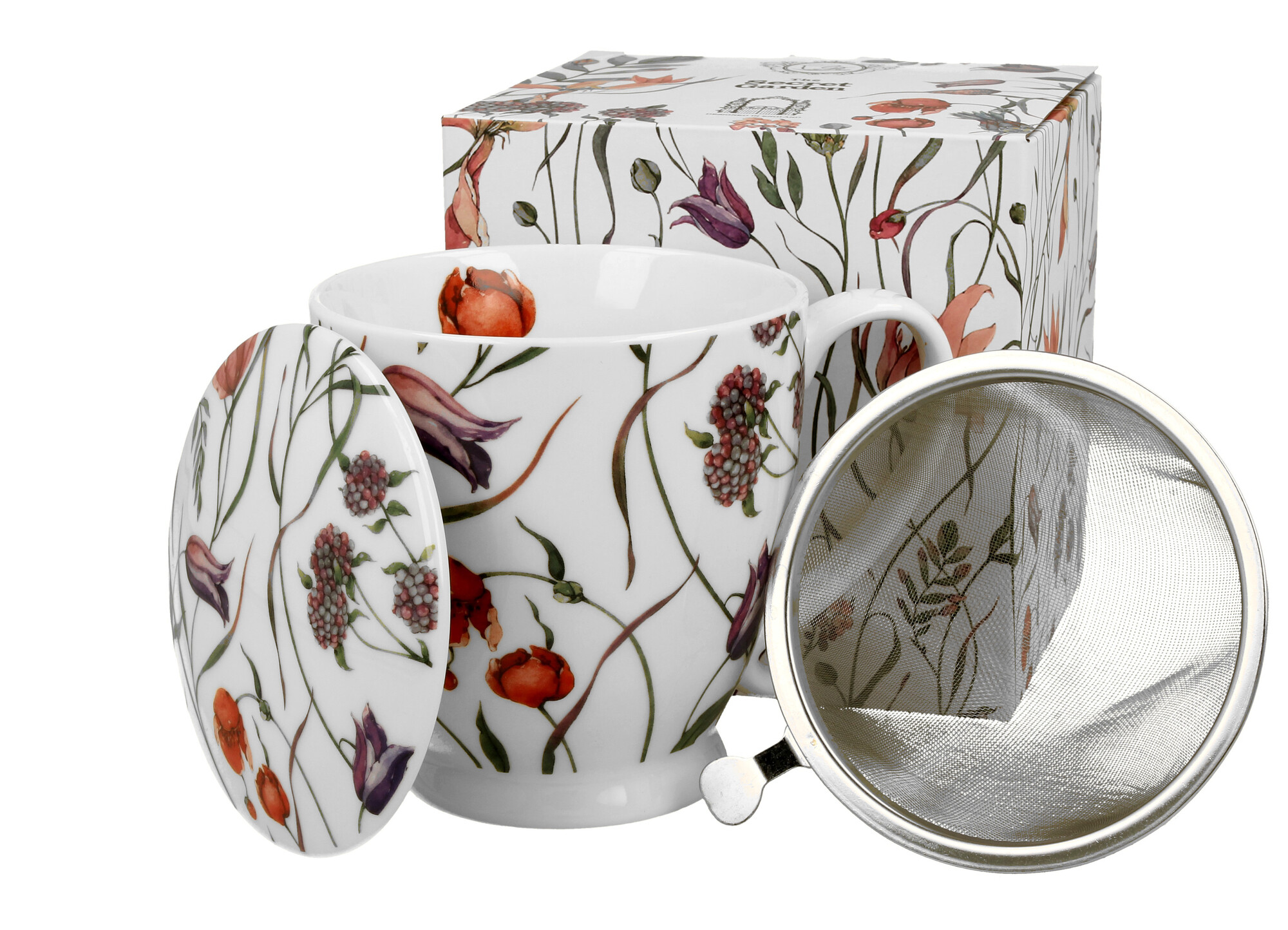 Kubek z zaparzaczem na stopce FLOWER MEADOW wchodzący w skład serii Kwiaty Royal, wykonany z porcelany New Bone China, charakteryzującej się elegancką i naturalną kremowo - białą barwą z delikatnym połyskiem, a także wyjątkową wytrzymałością.