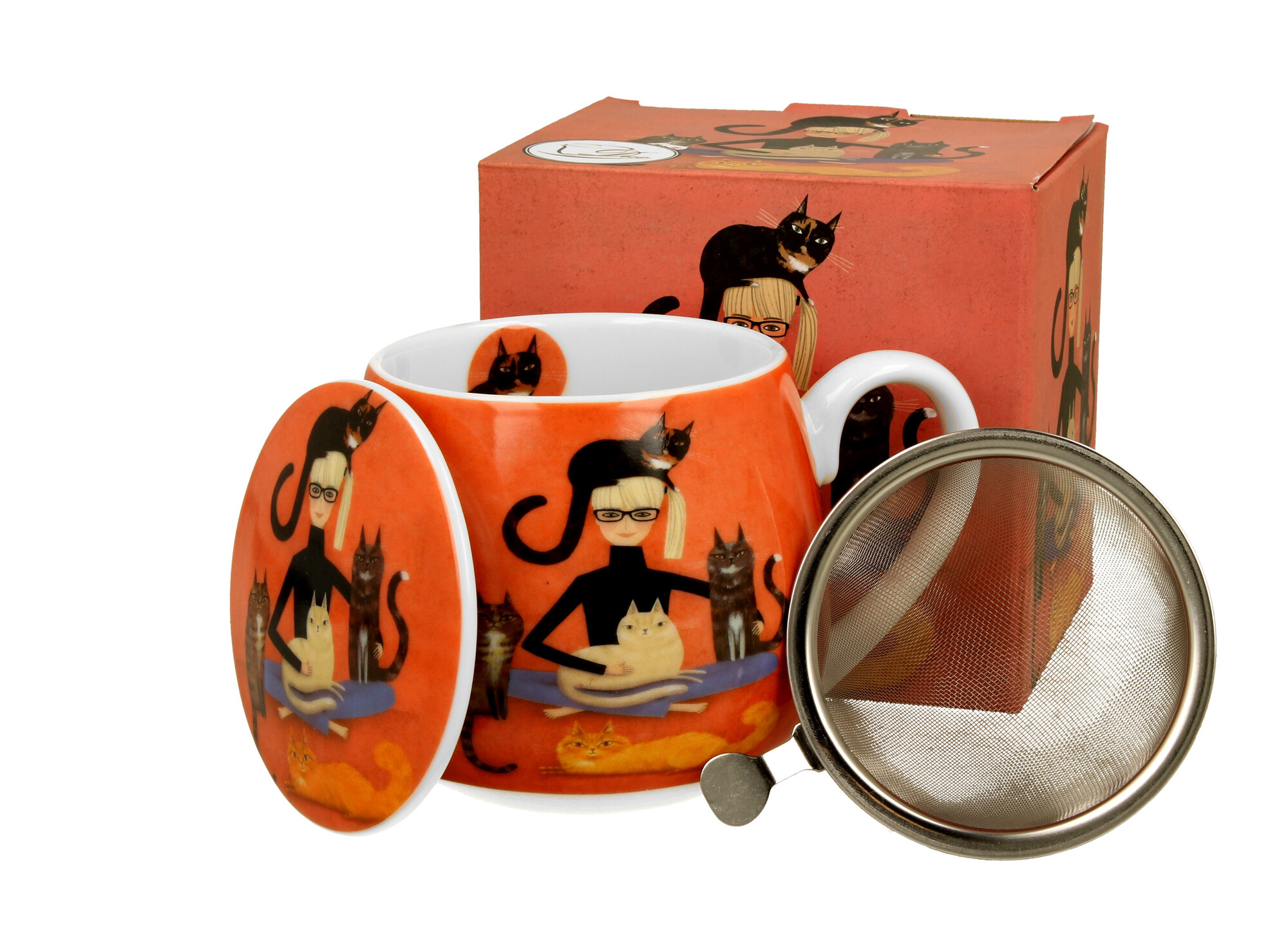 Kubek baryłka 430 ml z zaparzaczem i pokrywką Koci Świat CINDY I KOTY wchodzący w skład serii Animals, wykonany z porcelany New Bone China, charakteryzującej się elegancką i naturalną kremowo - białą barwą z delikatnym połyskiem, a także wyjątkową wytrzymałością.
