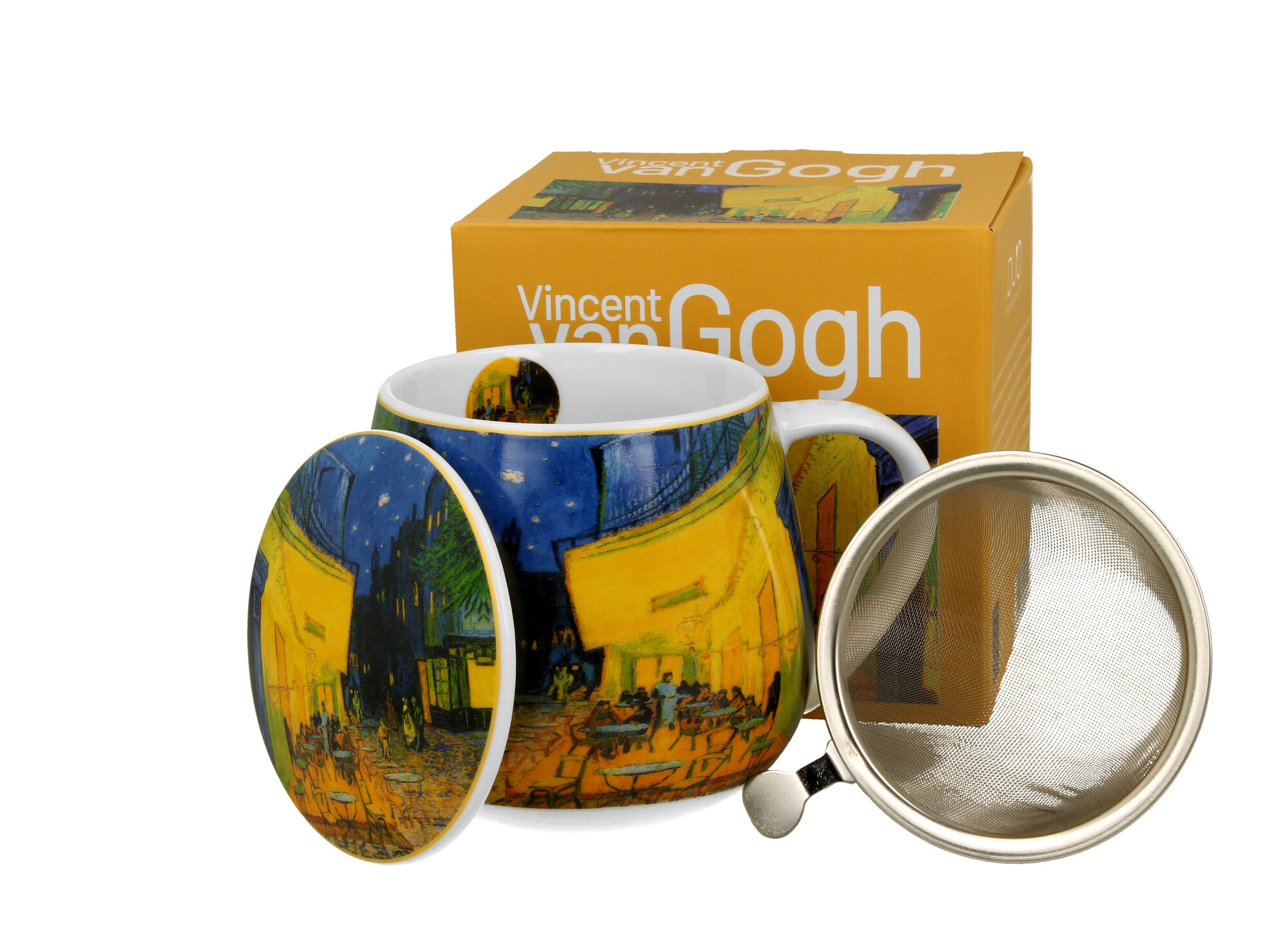 Kubek baryłka z zaparzaczem i pokrywką TERRACE AT NIGHT inspired by V. van Gogh wchodzący w skład serii Art Gallery, wykonany z porcelany New Bone China, charakteryzującej się elegancką i naturalną kremowo - białą barwą z delikatnym połyskiem, a także wyjątkową wytrzymałością.