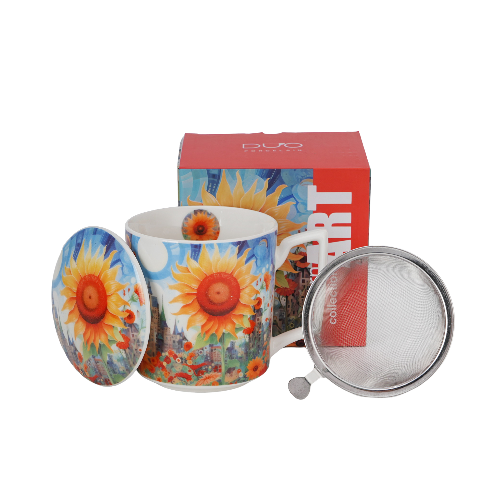 Linia zdobiona fantazyjnym obrazem pola słoneczników i drobnych kwiatów na tle wielkomiejskiego krajobrazu. Żółte i czerwone kwiaty, intensywnie błękitne niebo i futurystyczny klimat, tworzą magiczną atmosferę, która przenosi w świat marzeń i inspiracji. Ten niezwykły motyw pobudza wyobraźnię i zachęca do odkrywania piękna w codziennym życiu.