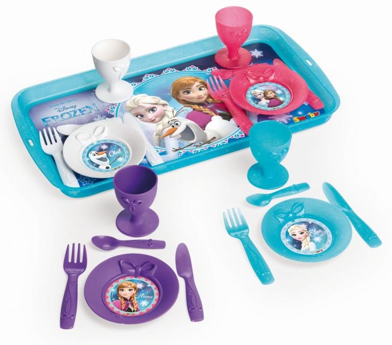 Sada čajového servisu s motivem princezen z filmu Ledové království s třpytivým efektem. Obsahuje 22 ks. 4 talíře, 4 poháry, 4 lžičky, 4 vidličky, 4 nože a servírovací tác s víkem. Rozměry tácu: 40 x 7,5 x 21 cm.