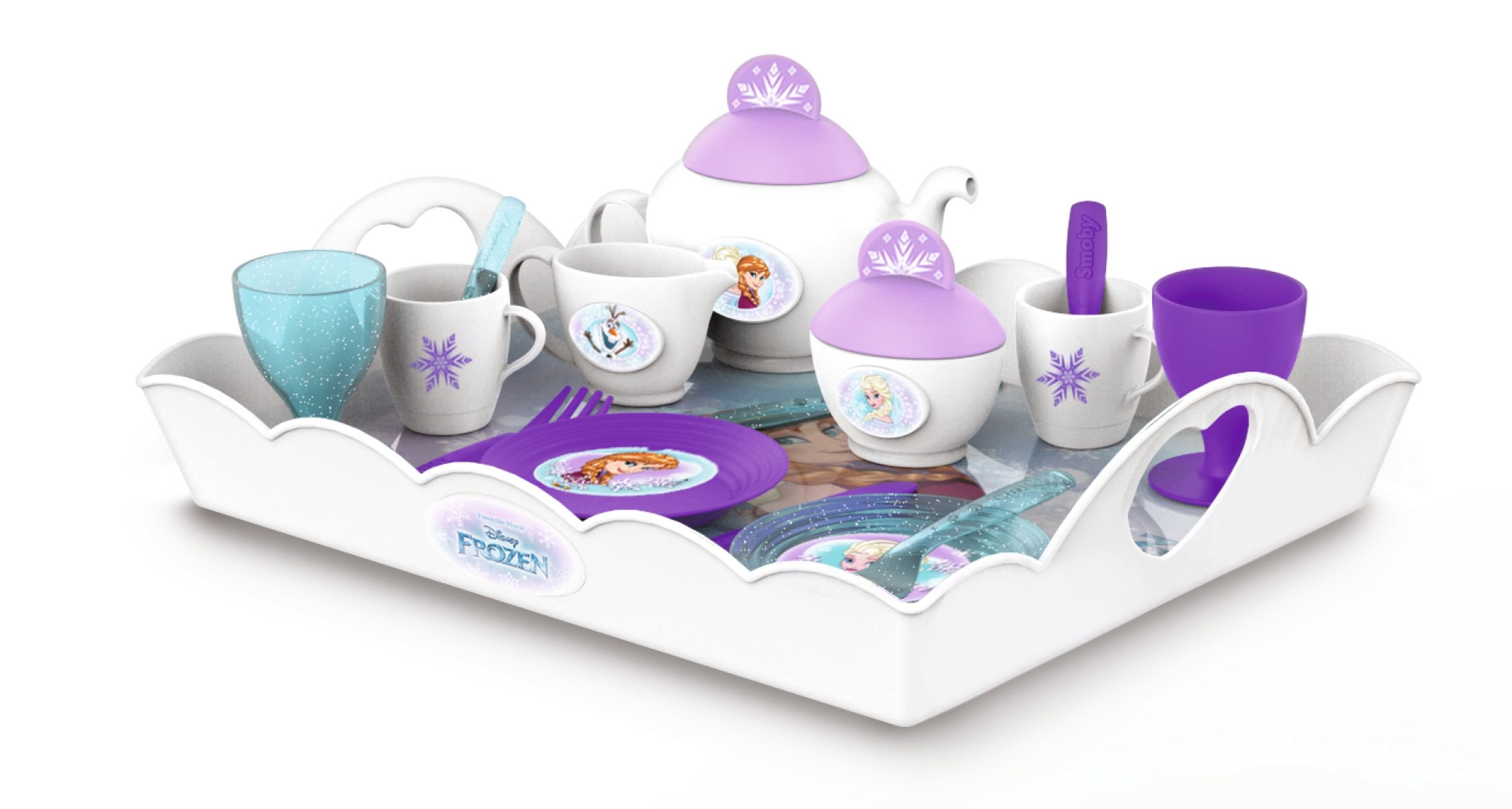 Souprava pro servírování čaje s tácem. Obsahuje 17 ks příslušenství: hrníčky, pohárky, talířky, příbor, konvičku na čaj s pokličkou, cukřenku s pokličkou a konvičku na mléko. Rozměry tácu 34 x 27 x 8,5 cm. Hmotnost: 0,465 kg.