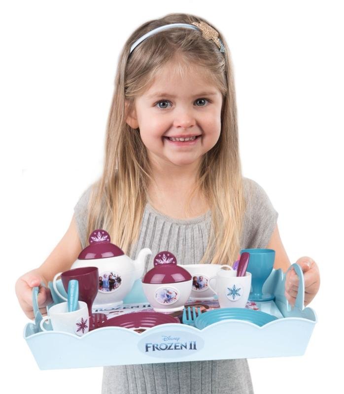 Souprava pro servírování čaje s tácem s motivem princezen z filmu Ledové království 2. Obsahuje 17 ks příslušenství: hrníčky, pohárky, talířky, příbor, konvičku na čaj s pokličkou, cukřenku s pokličkou a konvičku na mléko. Rozměry tácu 34 x 27 x 8,5 cm. Hmotnost: 0,465 kg.