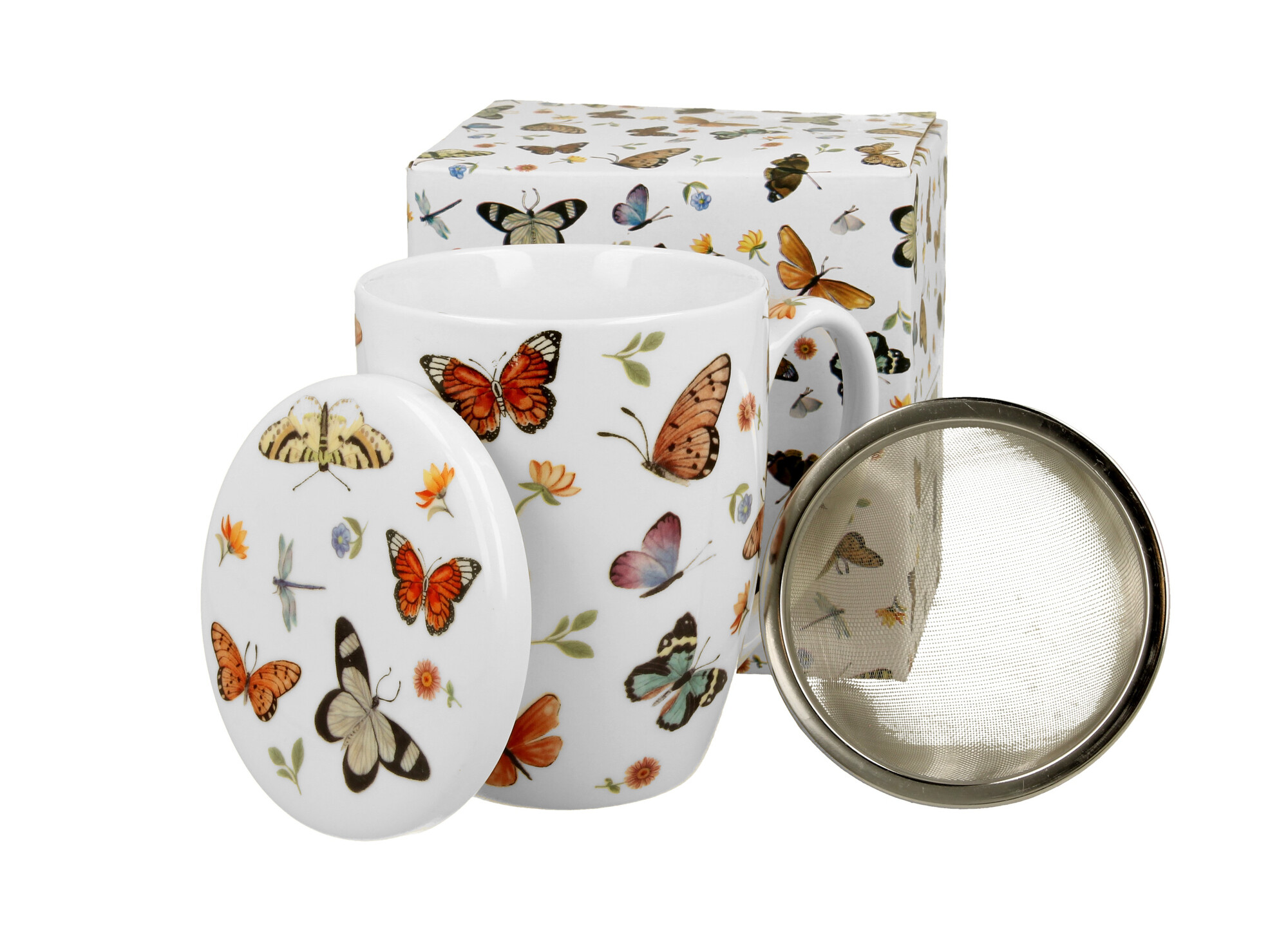 Kubek z zaparzaczem BUTTERFLIES wchodzący w skład serii CROCUS, wykonany z porcelany New Bone China, charakteryzującej się elegancką i naturalną kremowo - białą barwą z delikatnym połyskiem, a także wyjątkową wytrzymałością.