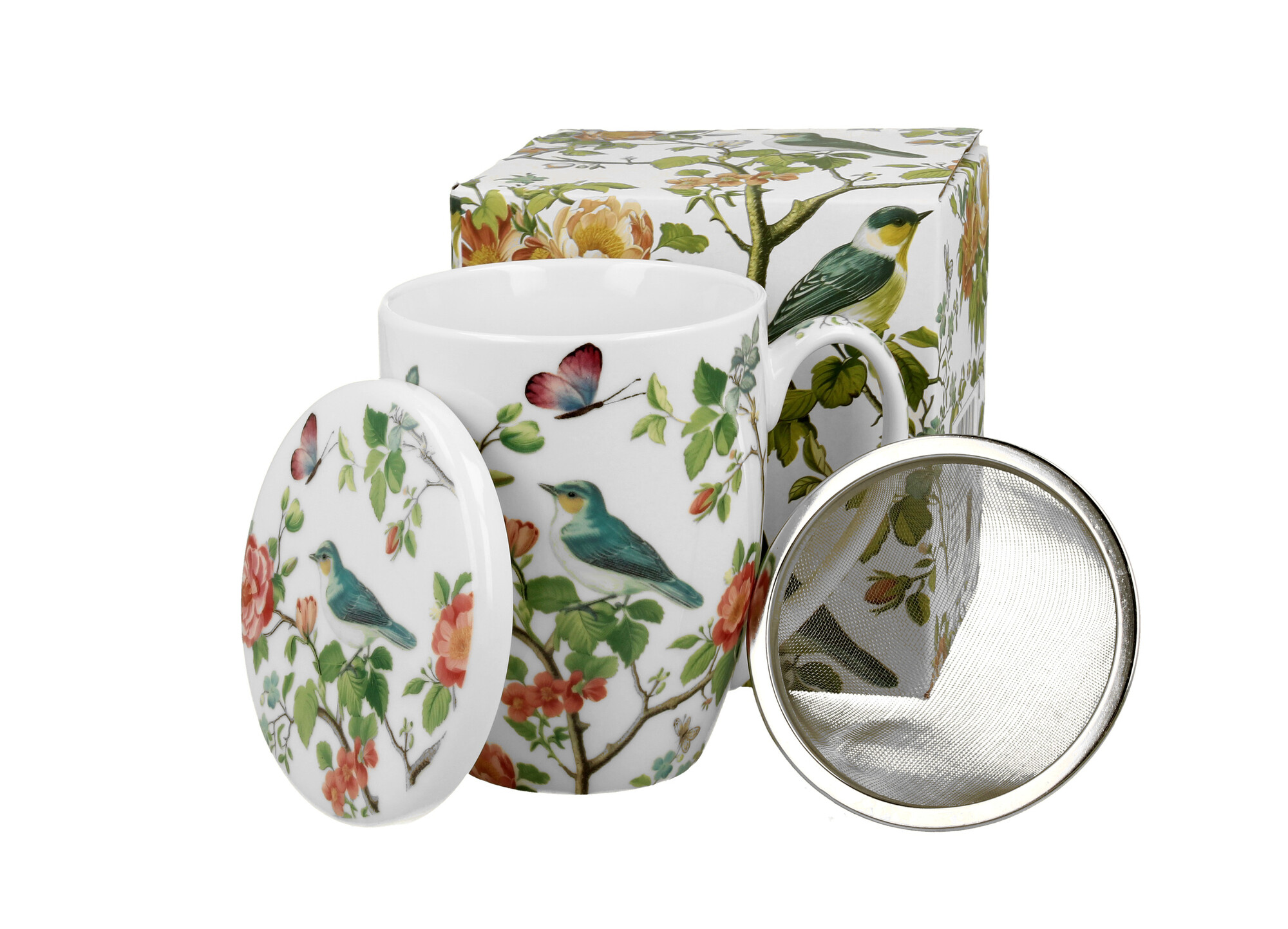 Kubek z zaparzaczem PTAKI NA GAŁĘZI wchodzący w skład serii CROCUS, wykonany z porcelany New Bone China, charakteryzującej się elegancką i naturalną kremowo - białą barwą z delikatnym połyskiem, a także wyjątkową wytrzymałością.