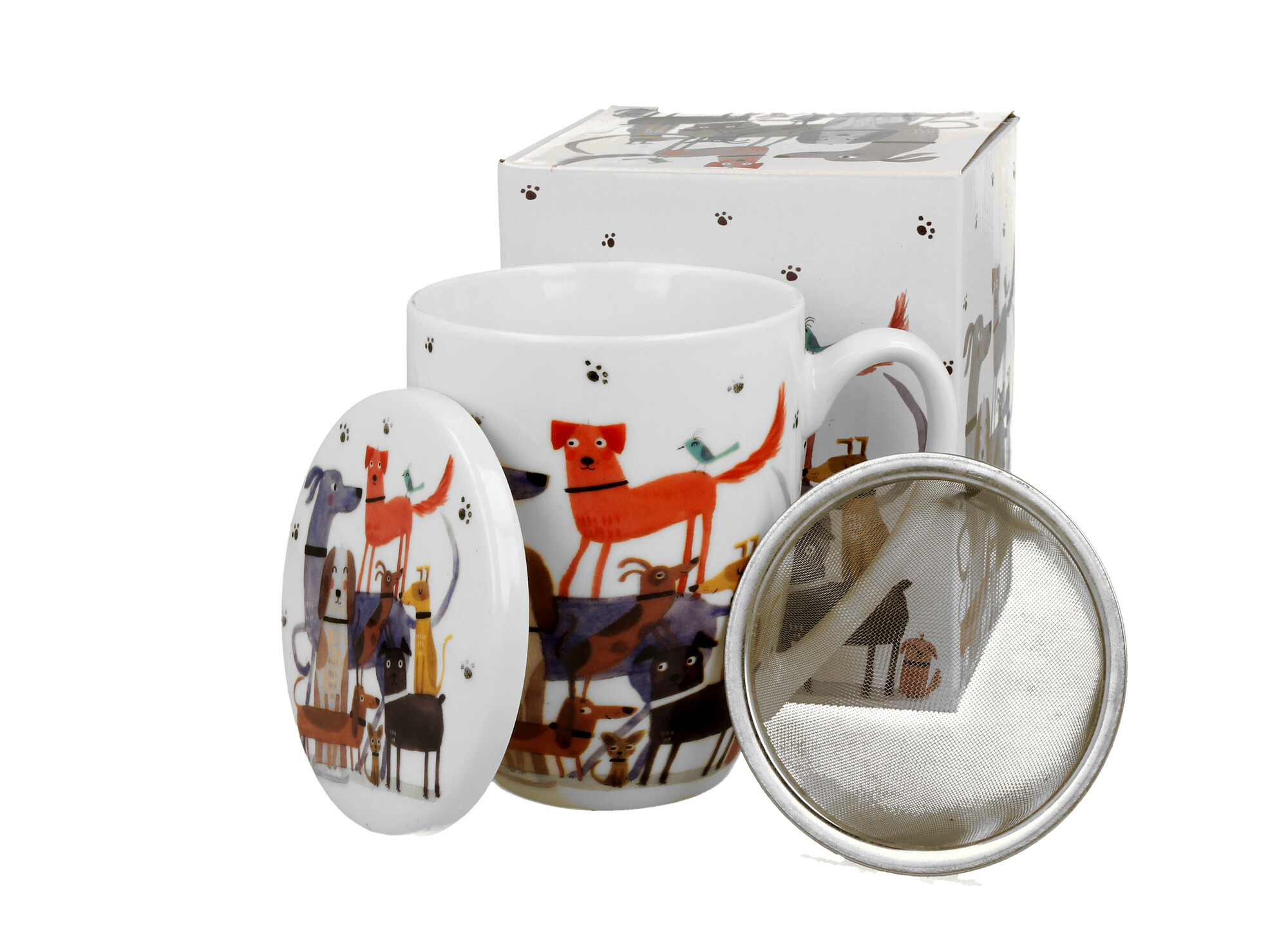 Kubek z zaparzaczem Psi Świat PSY NA SPACERZE wchodzący w skład serii Animals, wykonany z porcelany New Bone China, która charakteryzuje się naturalnym kremowo-białym kolorem z delikatnym połyskiem oraz wyjątkową wytrzymałością i trwałością, zachowując lekkość i finezję.