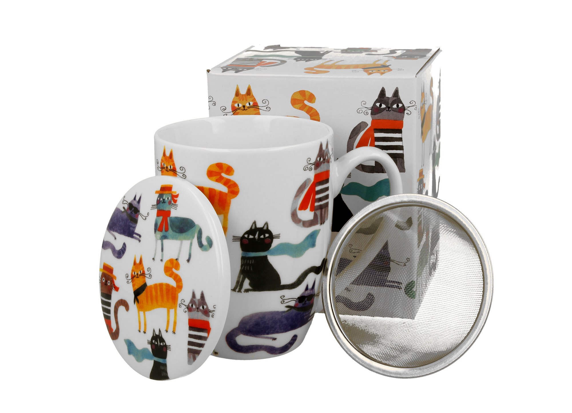 Kubek z zaparzaczem Koci Świat STYLOWE KOTY wchodzący w skład serii Animals, wykonany z porcelany New Bone China, która charakteryzuje się naturalnym kremowo-białym kolorem z delikatnym połyskiem oraz wyjątkową wytrzymałością i trwałością, zachowując lekkość i finezję.