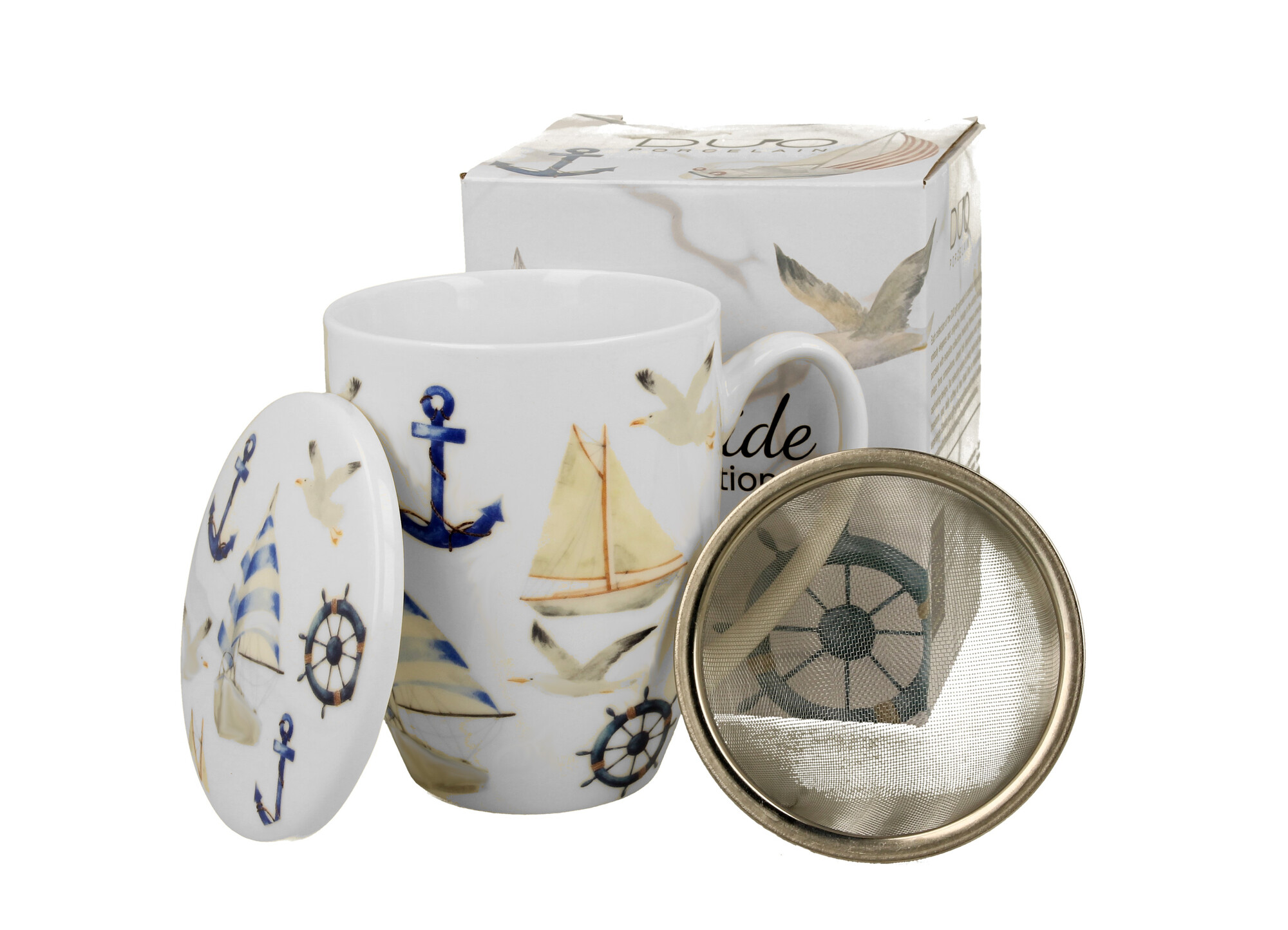 Kubek z zaparzaczem ŻAGLÓWKI wchodzący w skład serii Seaside, wykonany z porcelany New Bone China, która charakteryzuje się naturalnym kremowo-białym kolorem z delikatnym połyskiem oraz wyjątkową wytrzymałością i trwałością, zachowując lekkość i finezję.