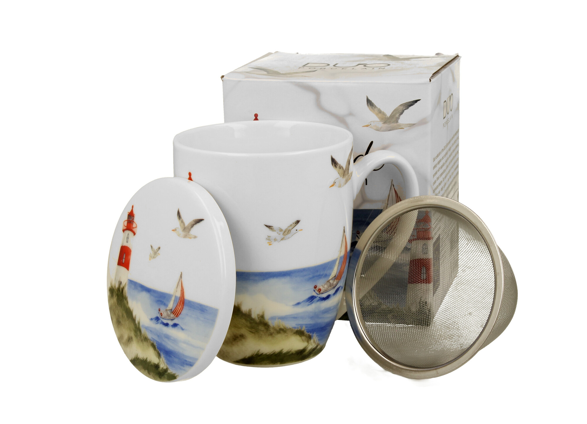 Kubek z zaparzaczem LATARNIA MORSKA wchodzący w skład serii Seaside, wykonany z porcelany New Bone China, która charakteryzuje się naturalnym kremowo-białym kolorem z delikatnym połyskiem oraz wyjątkową wytrzymałością i trwałością, zachowując lekkość i finezję.