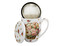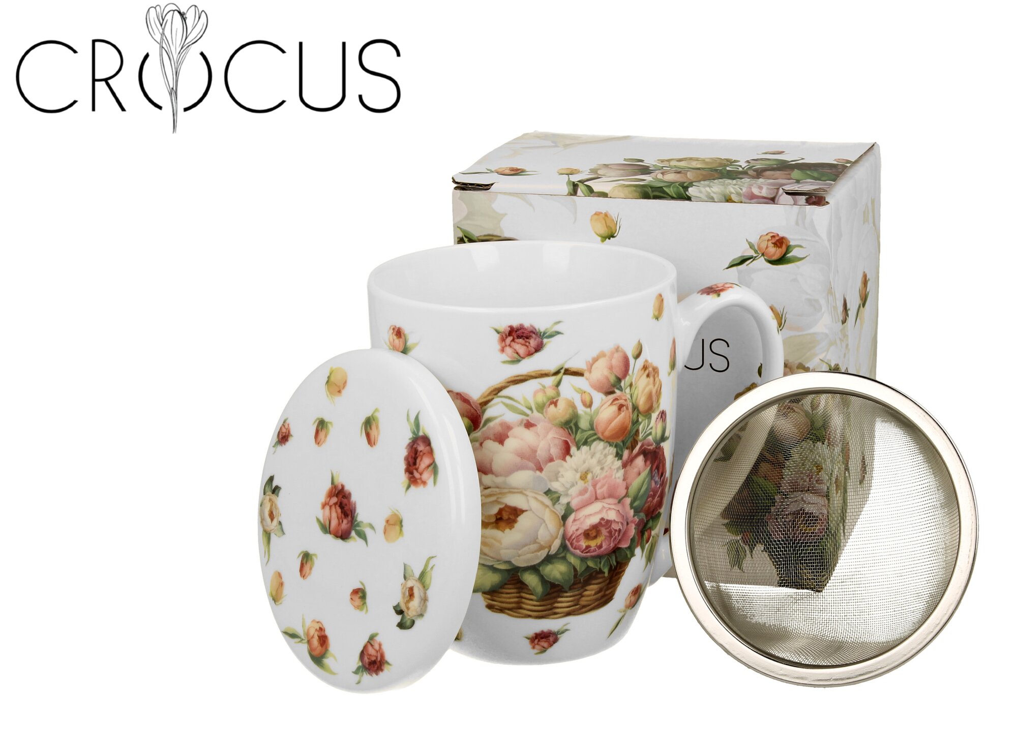 Kubek z zaparzaczem Kosze Kwiatów PIWONIE wchodzący w skład serii CROCUS, wykonany z porcelany New Bone China, charakteryzującej się elegancką i naturalną kremowo - białą barwą z delikatnym połyskiem, a także wyjątkową wytrzymałością.