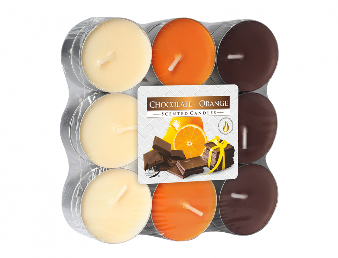 Čajová svíčka vonící po čokoládě a pomeranči, v hliníkovém kalíšku. Obsahuje esenciální oleje. Má certifikát kvality RAL, který garantuje bezpečnost a kvalitu použitých materiálů. Velikost: průměr 3,9 cm, výška 1,5 cm. Balení: 18 ks (3 řady po 3 kusech, 2 vrstvy) v igelitu s obrázkem. Hmotnost: 18x11g. Doba hoření: cca 4 hodiny. Barva: krémová, oranžová, hnědá.