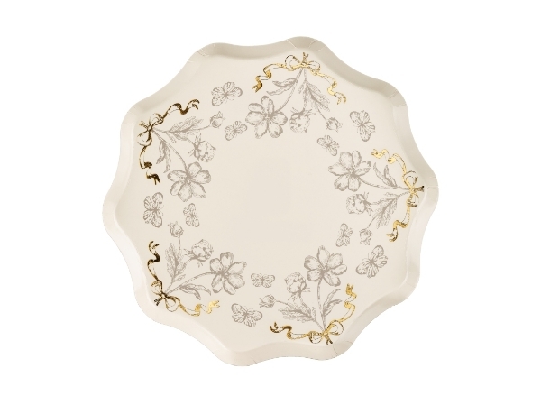 Průměr: 20 cmMateriál: papírBarva: béžová se zlatým a tmavě béžovým potiskemBalení: 6 ks