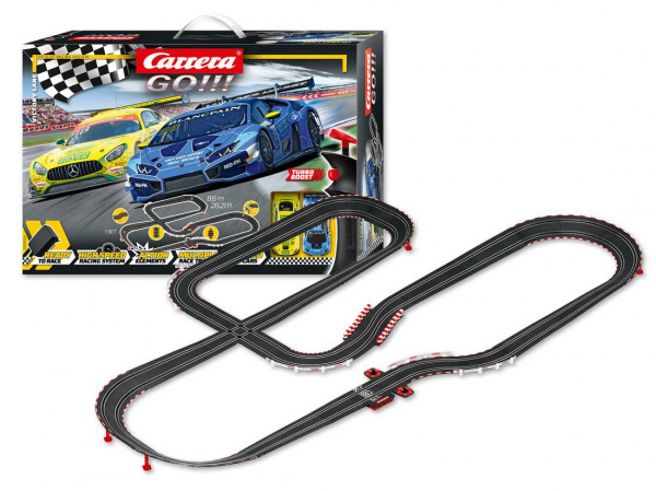 Autodráha Carrera GO!!! dlouhá 8,6m s auty Mercedes-AMG GT3 a Lamborghini Huracán GT3), obsahuje, křižovatku, klopenou zatáčku, zúžení dráhy, rovinky, zatáčky, díl s počítadlem kol a další díly. Můžete si sestavit další různé trati podle plánu na obalu.