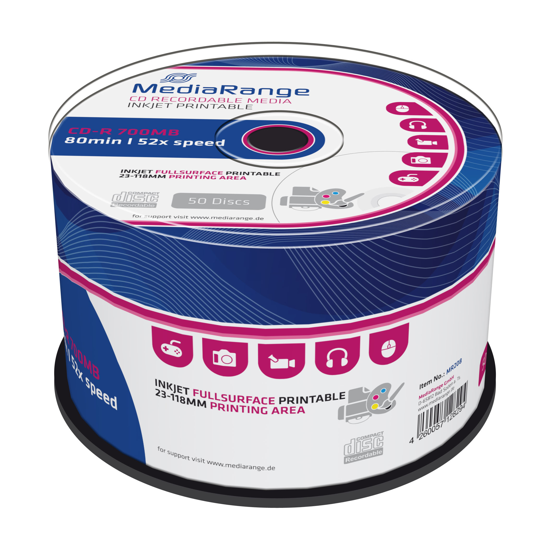 Kvalitní a cenově dostupná média CD-R značky MediaRange. Bílý celoplošný povrch k potištění na inkoustové tiskárně, poskytuje spolehlivý zápis dat s kapacitou až 700 MB při maximální rychlosti zápisu až 52x. Je to tedy ideální řešení běžného zálohování dat jako jsou zvukové záznamy, fotografie či další soubory. Média jsou balena po 50 kusech ve spindlu.