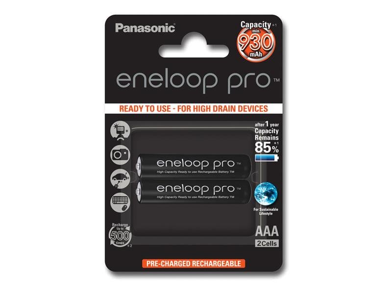 Jedinečné mikrotužkové baterie AAA (R03), které spojují výhody Eneloop, alkalických a díky vysoké kapacitě i klasických NiMh baterií. Jako jediná baterie tohoto typu nabízí kapacitu min. 930 mAh (běžně ale 1000mAh) při 500 dobíjecích cyklech. I tyto baterie mají samozřejmě maximálně eliminovaný efekt samovybíjení. Díky speciální technologii udrží tyto baterie po dobu jednoho roku až 85% své kapacity. Baterie Eneloop PRO se dodávají v nabitém stavu a jsou připraveny k okamžitému použití.
