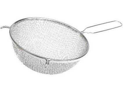Dva druhy kovového tkaniva pevně spojeného s obrubou z ocelového plechu a držadlem s háčky z ocelového drátu.