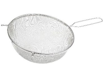 Kovové tkanivo pevně spojené s obrubou z ocelového plechu a držátkem s háčkem z ocelového drátu.