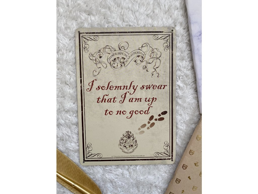 Béžová dekorativní cedulka na zeď s grafikou Pobertova plánku, s nápisem "I solemnly swear that I am up to no good" (Slavnostně přísahám, že jsem připraven ke každé špatnosti) z knižní a filmové sci-fi ságy Harry Potter.Velikost: 14,8 cm x 21 cmMateriál: 100% zinek číst celé