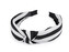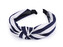 Široká čelenka je ozdobená pruhovanou látkou. Uprostřed je látka spletená do uzlu. Čelenka je elegantní a stylová, využijete ji na běžné nošení i na párty.