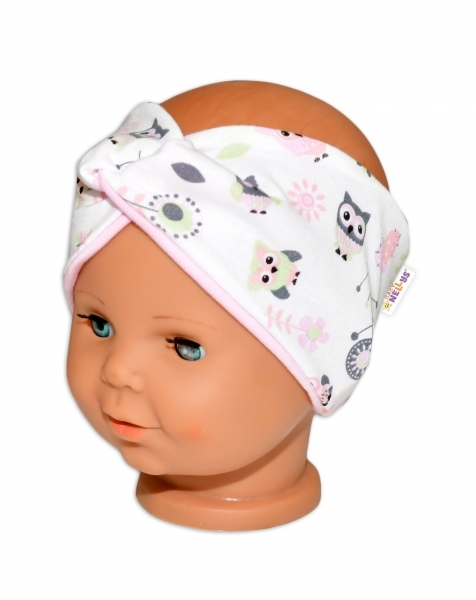 Baby Nellys Hand Made Jarní, bavlněná čelenka - dvouvrstvá, sovičky - sv. růžová, 104/116