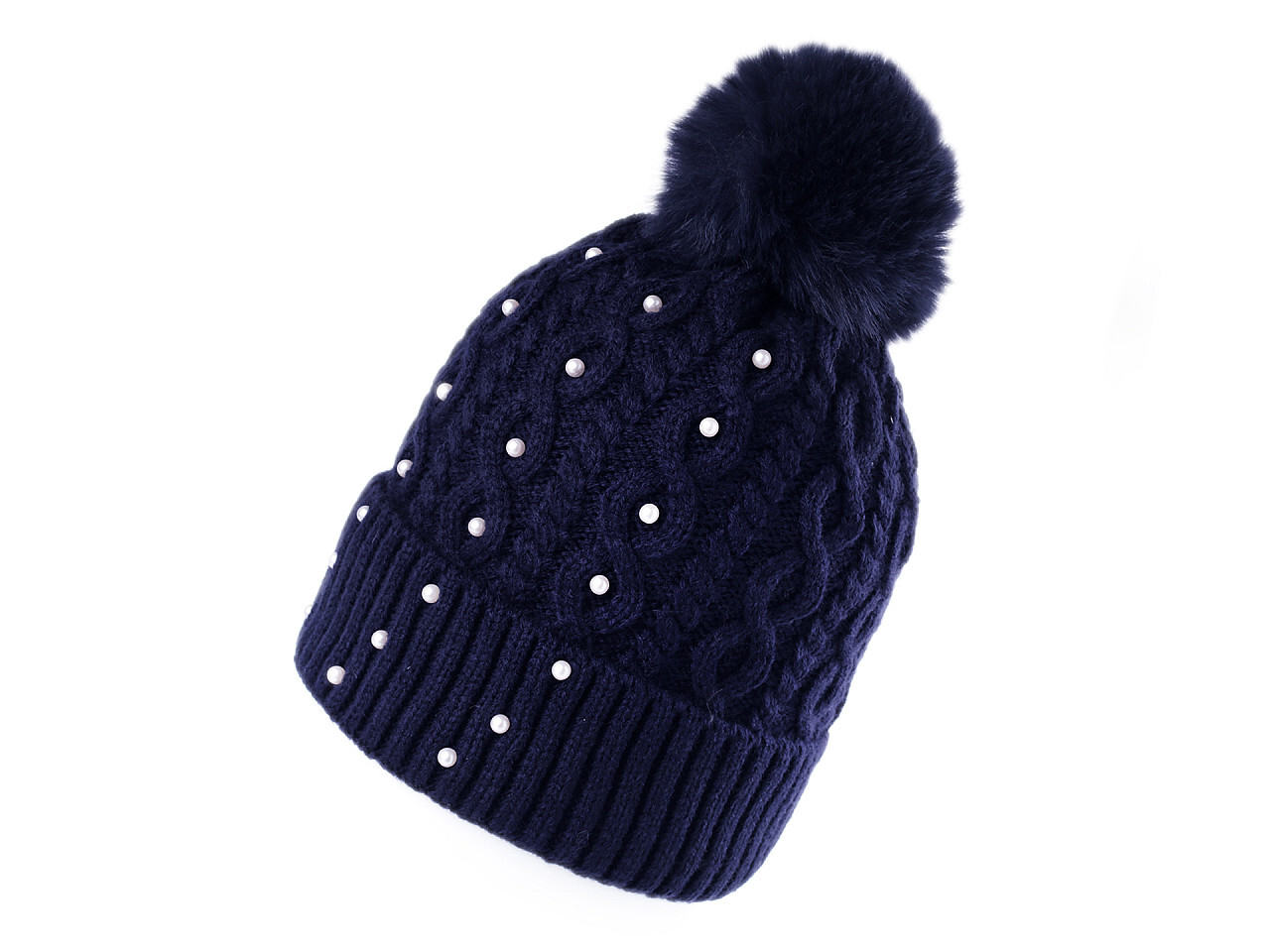 Pletená čepice s velkou bambulí a ohrnutým okrajem má zajímavý copánkový vzor. V přední části je ozdobená perlami. Bude vás hřát celou zimu, uvnitř má jemný plyš, jenž je velice příjemný na dotek. Bambule věrně imituje pravou kožešinu, perly jsou pevně přinýtované.