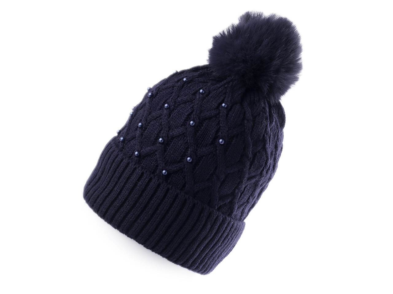 Dámská / dívčí zimní čepice s bambulí a perlami Emi Ross - 1 ks - 13 modrá tmavá