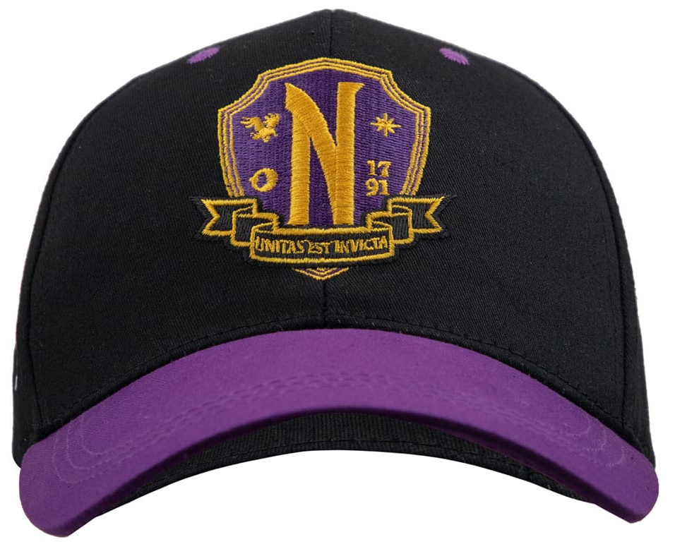Posuňte všechny hranice magie dále s touto černo-fialovou baseballovou kšiltovkou do stylu Nikdyvíc akademie ze seriálu Wednesday. Otevřená v zadní části a nastavitelná pro pohodlné nošení a optimální přizpůsobení každé hlavičce.