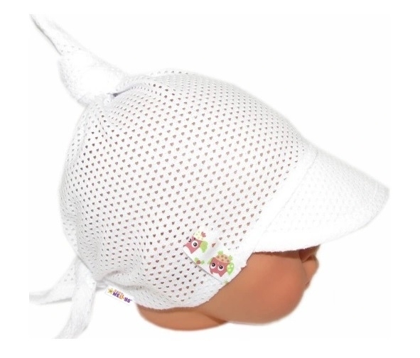 Baby Nellys Dětský síťkovaný šátek s kšiltem na zavazování, GIRL sovičky - bílý ; 68-86 (6-18m)