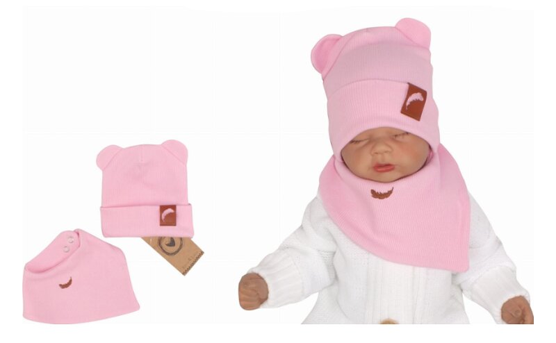 Z&Z Dvouvrstvá žebrovaná čepička s oušky + šátek, růžová, 68/74; 68/74 (6-9m)