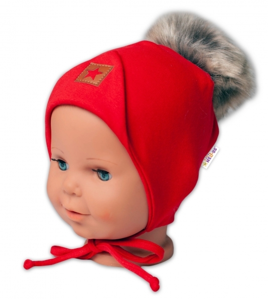 Zimní,podzimní bavlněná dvouvrstvá čepice s bambulí na zavazování Star,červená, vel. 68/80; 68-80 (6-12m)