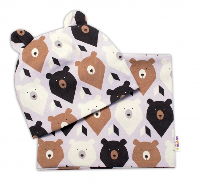 Dvouvrstvá čepice s oušky + komínek Medvědi, hnědá/smetanová, vel. 80/92; 80-92 (12-24m)