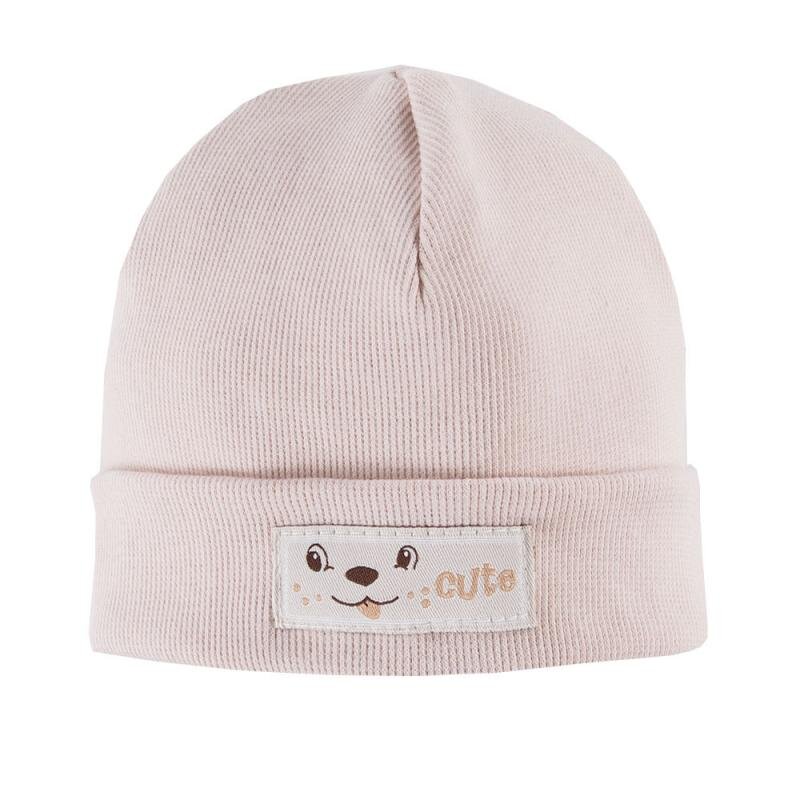 Kremowa czapka dziecięca ze ściągacza. Czapka dziecięca wykonana z rozciągliwej dwu warstwowej bawełny. Z przodu czapki znajduje się naszywka wykonana tak, aby nie podrażniać delikatnej skóry dziecka.