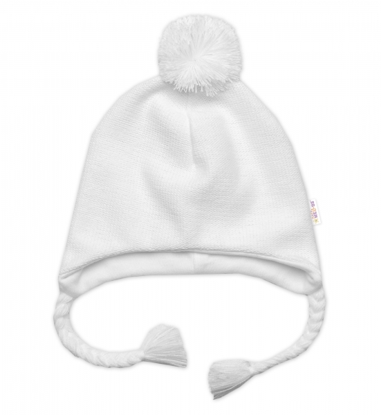 Pletená čepice s bavlněnou podšívkou, bambulkou a copánky, vel. 68/74; 68/74 (6-9m)