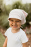 Dětský mušelínový klobouček na hlavu s kšiltem v modré barvě Petrol chrání hlavičku miminka před slunečními paprsky a ouška před větrem. Šátek je termoregulační a zabraňuje přehřátí hlavičky miminka. Rostoucí a vhodný od narození do 3-4 let.