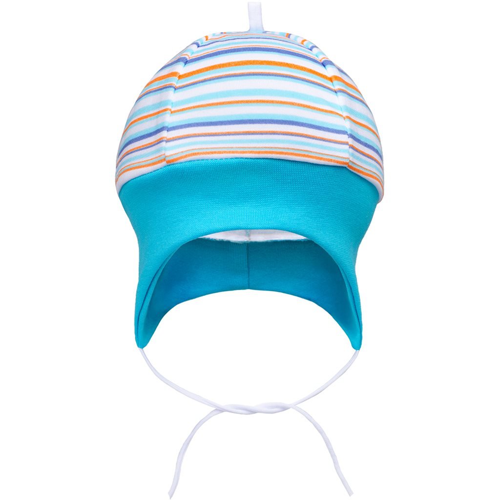 Bavlněná kojenecká čepička New Baby Puppik 2. Čepička má široký pružný lem, který krásně kryje oušká a netlačí, zavazuje se na tkaničky. Čepičku zdobí originální pruhy. Složení: 100% bavlna. Obvod: cca 38 cm.