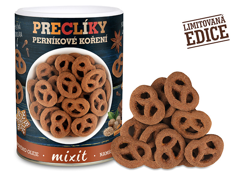 Limitovaná Vánoční edice. Je tu Vánoční preclík uloupnutý z perníkové chaloupky. :-) Přikutálel se k nám a chutná prostě pohádkově. Pod bohatou vrstvou mléčné čokolády a omamně voňavého perníkového koření se skrývá jemně solený a dozlatova vypečený preclík. Stačí otevřít víčko tubusu a ucítíte to sami...tak voní Vánoce a k tomu skořice, muškátový ořech, koriandr, zázvor, fenykl, hřebíček, nové koření, anýz, badyán, pepř černý a kardamon.