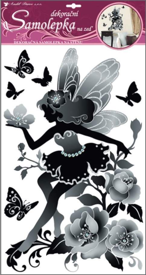 Samolepky na zeď víla černá glitry a kamínky 50x32cm