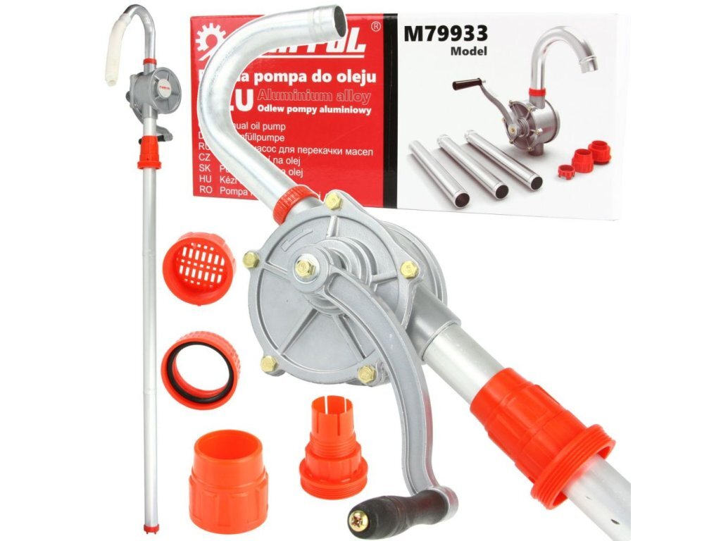 Ruční čerpadlo na pohonné hmoty, olej, je nezbytným zařízením v místech bez přístupu k elektřině. Čerpadlo je vhodné pro všechny modely originálních sudů na palivo nebo olej. Díky možnosti našroubovat více segmentů potrubí je zařízení velmi univerzální a hodí se do většiny standardních výšek sudů. Spojka se závitem umožňuje bezpečné upevnění čerpadla k sudu a pohodlná kliková rukojeť usnadňuje čerpání. Přiložená výstupní tryska usnadňuje usměrňování toku paliva nebo oleje.