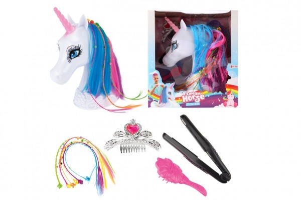 Česací hlava jednorožec 22x28cm plast s barevnými copánky s doplňky v krabici 31x32x14cm