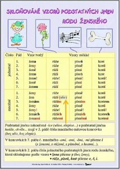 Tato karta je úplně nejideálnější pro první stupeň základní školy - je pěkně vybarvená, obsahuje tak akorát textu a navíc kopíruje nástěnné obrazy vysvětlující novou látku. Je tedy ideální, když učitel ukazuje u tabule a žáci si v zmenšených kopiích sami vyhledávají. V tomto případě se jedná o vzory rodu ženského. Každý vzor je vybaven obrázkem a rozdělen do skupinky měkkých a tvrdých vzorů. Následně se na kartičce objevuje jeho vyskloňování ve všech pádech i obou číslech. Moc povedená pomůcka.