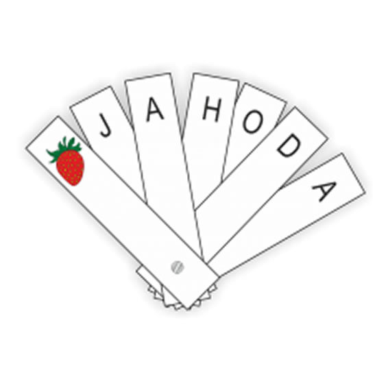 Soubor vějířů obsahuje slova z pracovní učebnice Písmena. Vějíře slouží k syntéze slov z nabízených písmen. Využití: 1. k syntéze celého slova dle obrázku 2. k opisu do pracovní učebnice Písmena, do školních sešitů, pracovních listů 3. k tvoření vět 4. pro práci s významem slov a jejich mluvnických vlastností seznam slov: ANANAS, ANDĚL, ANDULKA, ANGREŠT, ANTÉNA, AUTO, BABIČKA, BÁBOVKA, BERUŠKA, BĚLÁSEK, BĚŽEC, BROUK, CIBULE, CITRÓN, ČEPICE, ČTYŘLÍSTEK, DIVADLO, DIVOČÁK, DUDLÍK, EMENTÁL, ESKYMÁK, EURO, FAZOLE, FOTOAPARÁT, FOTOGRAFIE, GLÓBUS, GORILA, HODINY, CHOBOTNICE, INDIÁN, INJEKCE, INKOUST, JABLKO, JAHODA, JEHLICE, KALHOTY, KAŠTAN, KOSTKY, KOTĚ, KROCAN, KYTARA, LAVIČKA, MĚSÍC, MĚSTO, MIMINKO, NĚMECKO, NITĚ, NOSOROŽEC, OKURKA, OUVEJ, PAPOUŠEK, PEXESO, PĚNA, PĚT, ŘEDKVIČKA, SANĚ, SILNICE, SLUNCE, SNĚHULÁK, ŠROUB, TABULE, TELEFON, TELEVIZE, TĚSTO, TISÍC, TISKÁRNA, TULIPÁN, ŤUKÁNÍ, UMYVADLO, UTĚRKA, UŽOVKA, VEVERKA, VĚTEV, VĚŽ, XYLOFON, ZÁPALKA, ŽIRAFA, ŽÍŽALA