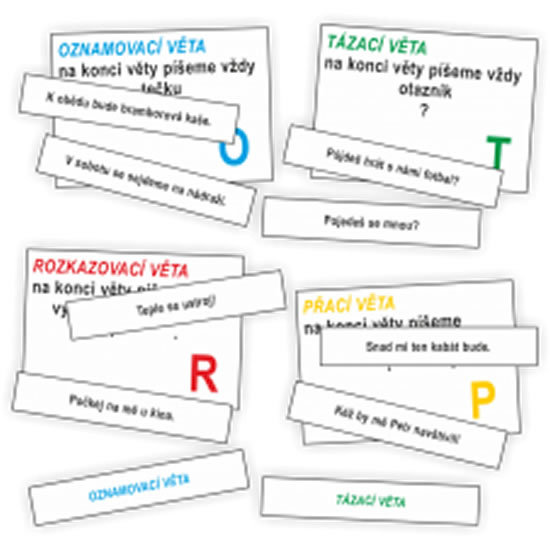 48 kartiček s větami ke třídění podle druhu vět.Součástí je i 1 sada podložek - Druhy vět - podložky.