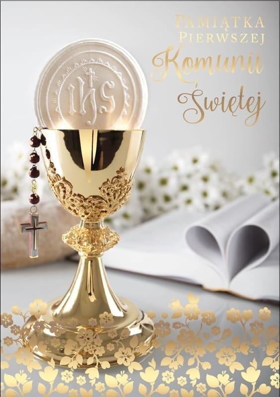 Kartka wielkości B6, zdobiona w zależności od wzoru metaliczną folią lub brokatem, kartka z tekstem w środku, kolorowa w środku i na zewnątrz.
