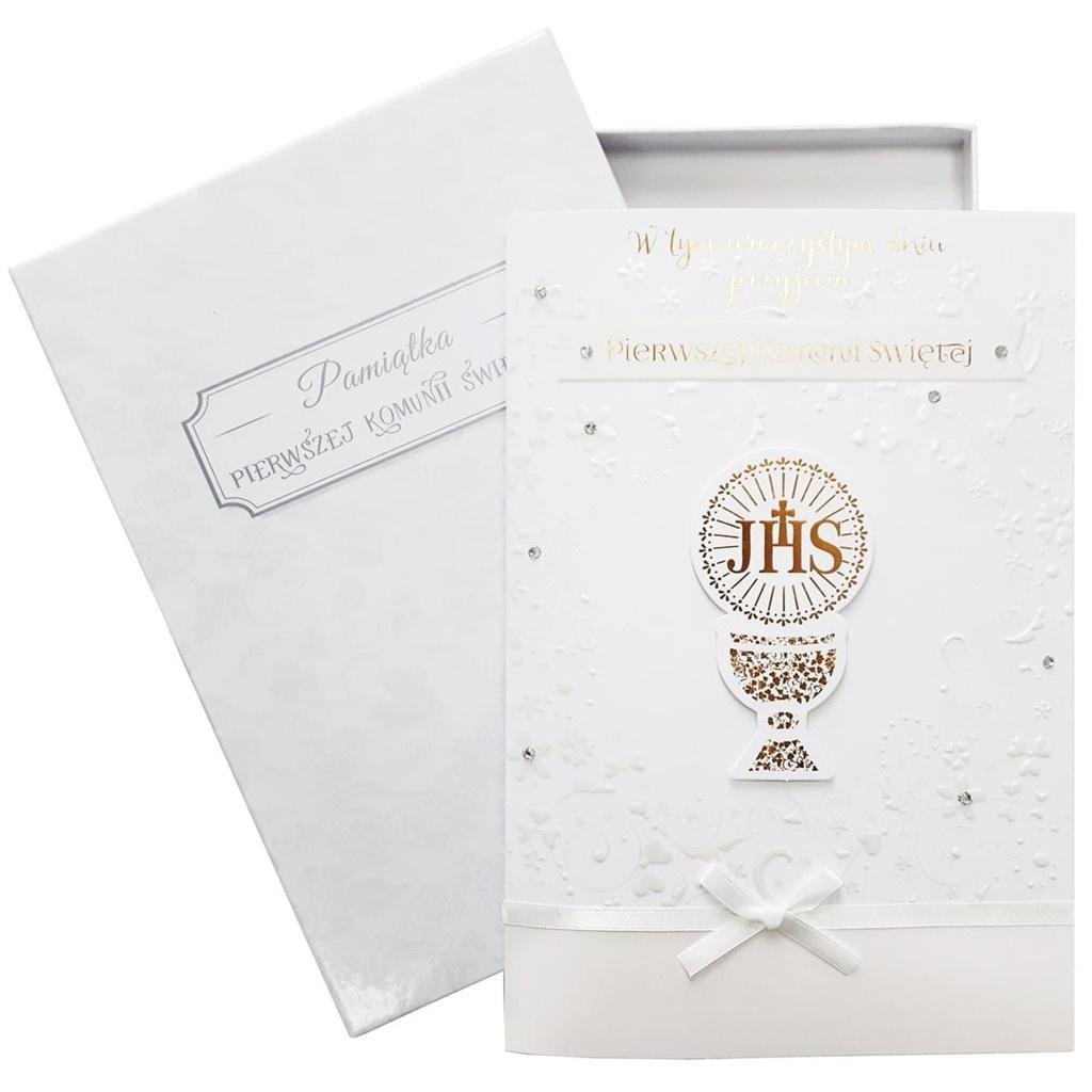 Cartissimo to więcej, niż kartka - to duży, bogato zdobiony karnet z kolorową wklejką w środku, opakowany w ozdobne pudełeczko otwierane, jak prezent. Taka kartka to idealny sposób na eleganckie przekazanie banknotów lub karty prezentowej. Cechy szczególne: wielkość: pudełko 27 x 19,5 cm, karnet nieco mniejszy, zdobienia: bogate ( w zależności od wzoru: tłoczenia, folia metaliczna lub perłowa, brokat, ozdobne elementy doklejane - kokardki itp.), opakowanie: na zewnątrz rękaw z PCV z logotypem i opisem zawartości, wewnątrz kartonowe pudełko, wnętrze kartki: kolorowa wklejka dodatkowa z tekstem życzeń, okazja: Komunia, styl: elegancki.