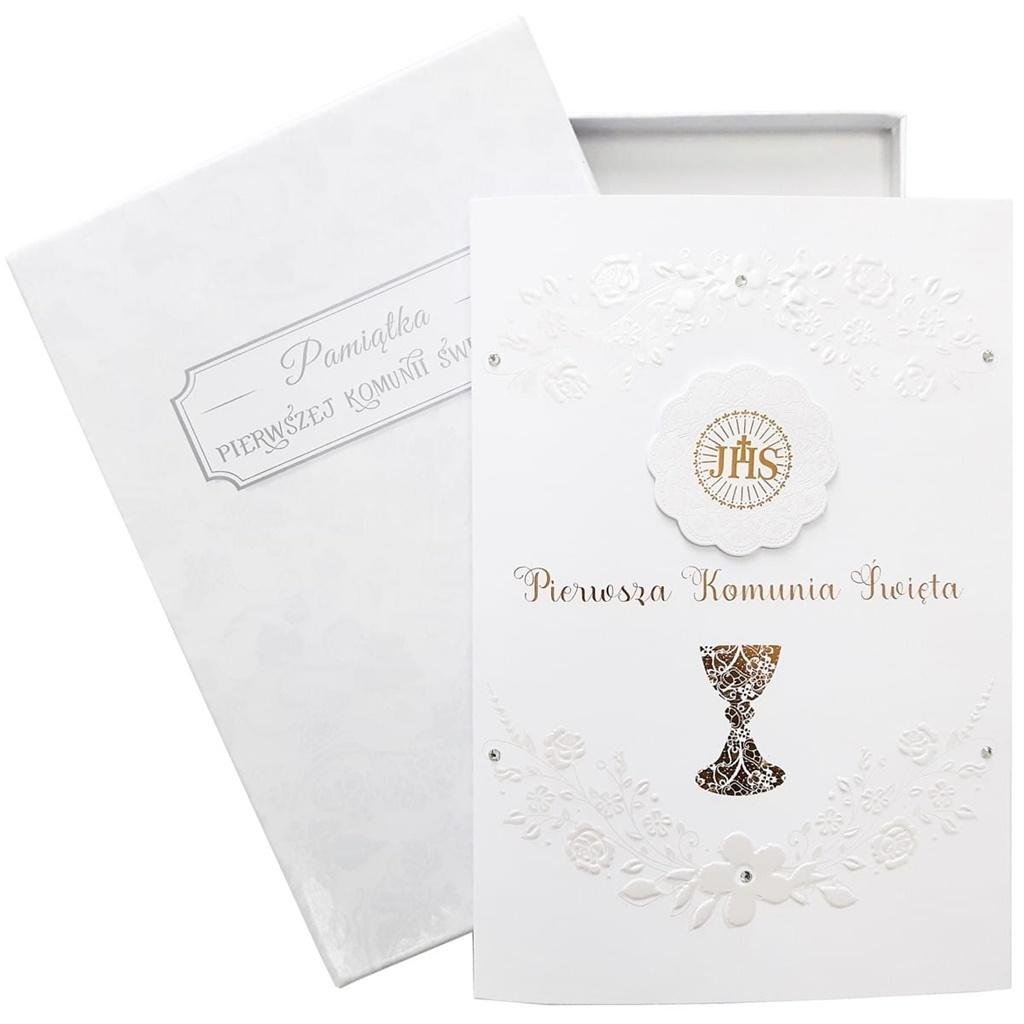 Cartissimo to więcej, niż kartka - to duży, bogato zdobiony karnet z kolorową wklejką w środku, opakowany w ozdobne pudełeczko otwierane, jak prezent. Taka kartka to idealny sposób na eleganckie przekazanie banknotów lub karty prezentowej. Cechy szczególne: wielkość: pudełko 27 x 19,5 cm, karnet nieco mniejszy, zdobienia: bogate ( w zależności od wzoru: tłoczenia, folia metaliczna lub perłowa, brokat, ozdobne elementy doklejane - kokardki itp.), opakowanie: na zewnątrz rękaw z PCV z logotypem i opisem zawartości, wewnątrz kartonowe pudełko, wnętrze kartki: kolorowa wklejka dodatkowa z tekstem życzeń, okazja: Komunia, styl: elegancki.