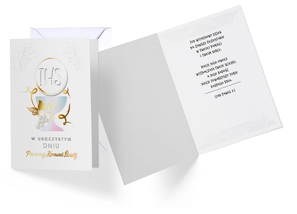 Kartka B6 z ozdobnej serii Dream Cards na Komunię - nieduża, ale robi wrażenie dzięki atrakcyjnej kolorystyce i ciekawym zdobieniom. To idealny wybór łączący przyjazną cenę z jakością. Cechy szczególne: wielkość: B6, 16.6 x 11.7 cm po złożeniu, koperta: w zestawie, kolorowa, zdobienia: różnorodne, bogate (w zależności od wzoru: przyklejane dekoracje, elementy biżuteryjne, odstawniki, brokat metaliczne folie, tłoczenia itp.), okazja: Komunia.