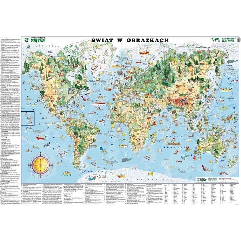 Mapa ścienna dla dzieci w obrazkach to wspaniała propozycja dla tej grupy wiekowej. Przyświeca jej cel łączyć przyjemne z pożytecznym czy mówiąc jeszcze inaczej uczyć bawiąc! Mapa ta przedstawia najważniejsze miejsca wszystkich kontynentów, prezentuje charakterystyczne rośliny czy zwierzęta, ale także w istotny sposób wyjaśnia rysunki poprzez legendę zawartą na mapie.