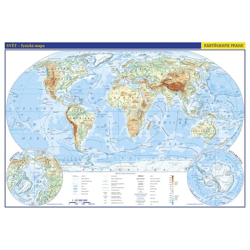 Oboustranná mapa světa vám poskytne základní přehled o jeho politickém i fyzickém uspořádání. Fyzická mapa obsahuje všechna hlavní světová pohoří i s jejich nejvyššími vrcholy, nejdelší a nejvýznamnější řeky, největší jezera, ale také další významné přírodní tvary a oblasti: pouště, ostrovy a poloostrovy, nížiny, prolákliny nebo oceány a moře, včetně zálivů, průlivů a podmořských tvarů. V politické mapě naleznete všechny státy, včetně jejich hlavních měst, ale také závislá a sporná území. Evropa a oblast Karibského moře jsou zpracovány ve větších měřítcích, pro jejich lepší přehlednost. Praktický formát nabízí široké využití - od podložky na stůl, vyvěšení na rodinnou či pracovní nástěnku po praktickou školní pomůcku. oboustranná laminovaná mapa přehledná mapa světového horopisu a vodopisu fyzické výřezy Arktidy a Antarktidy politické uspořádání světa se všemi státy a jejich hlavními městy podrobné výřezy Evropy a Karibiku