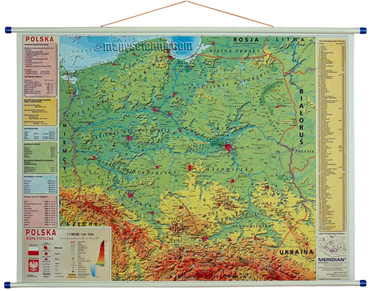 Ścienna mapa gabinetowa przedstawiająca ukształtowanie powierzchni Polski. Mapę fizyczną Polski wzbogacono dodatkowo o informacje na temat ochrony środowiska. Umieszczone są na niej parki narodowe, parki krajobrazowe, ostoje wodno - błotne objęte konwencją Ramsarską oraz rezerwaty biosfery...