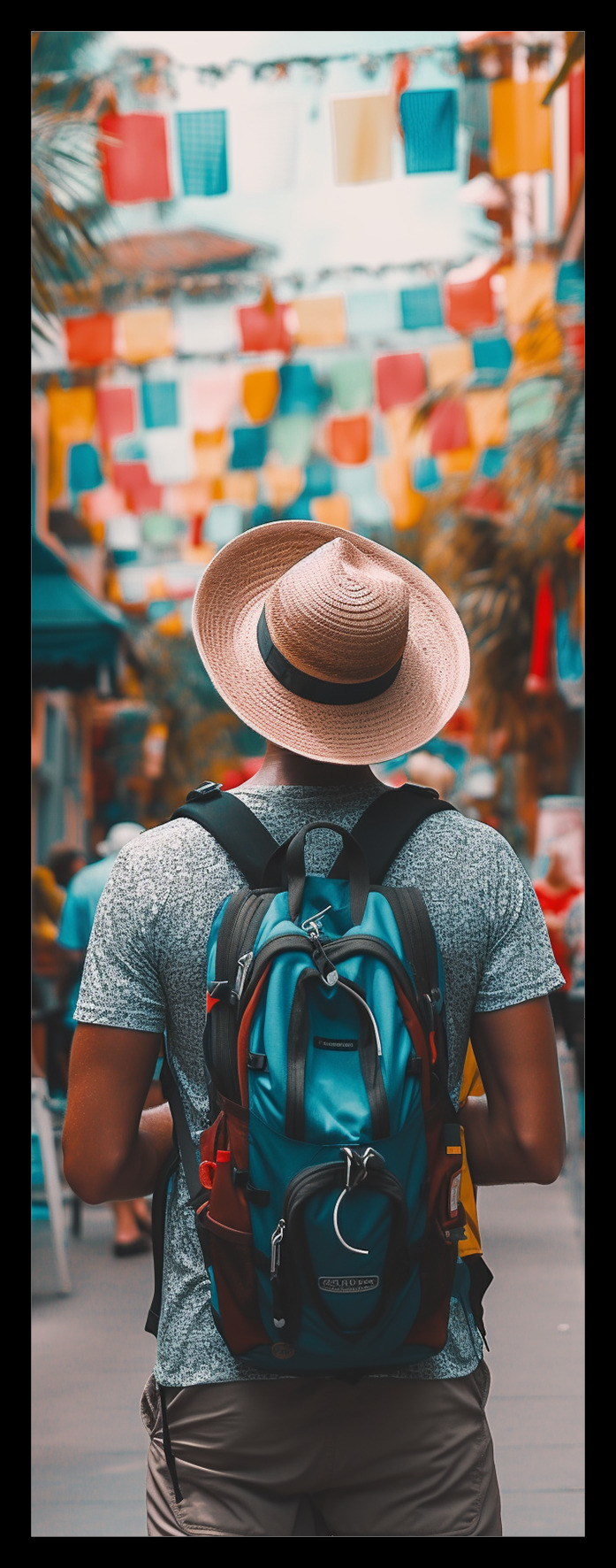 Tato sběratelská záložka s motivem živého městského života zachycuje mladého muže s slaměným kloboukem a batůžkem, který s lehkostí putuje pestrými uličkami plnými barevných domů, uměleckých prodejen a rušných tržišť. Je to víc než jen záložka - je to okno do světa plného objevování nových kultur, chutí a příběhů.